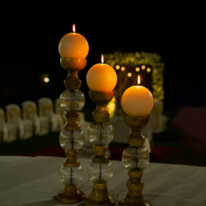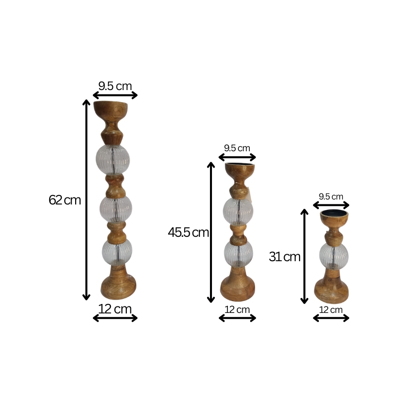 A set of three decorative candle stands of different heights. Each stand is made of light-colored wood and features fluted, transparent glass spheres stacked between wooden sections. They have a wooden cup at the top to hold a candle.