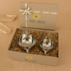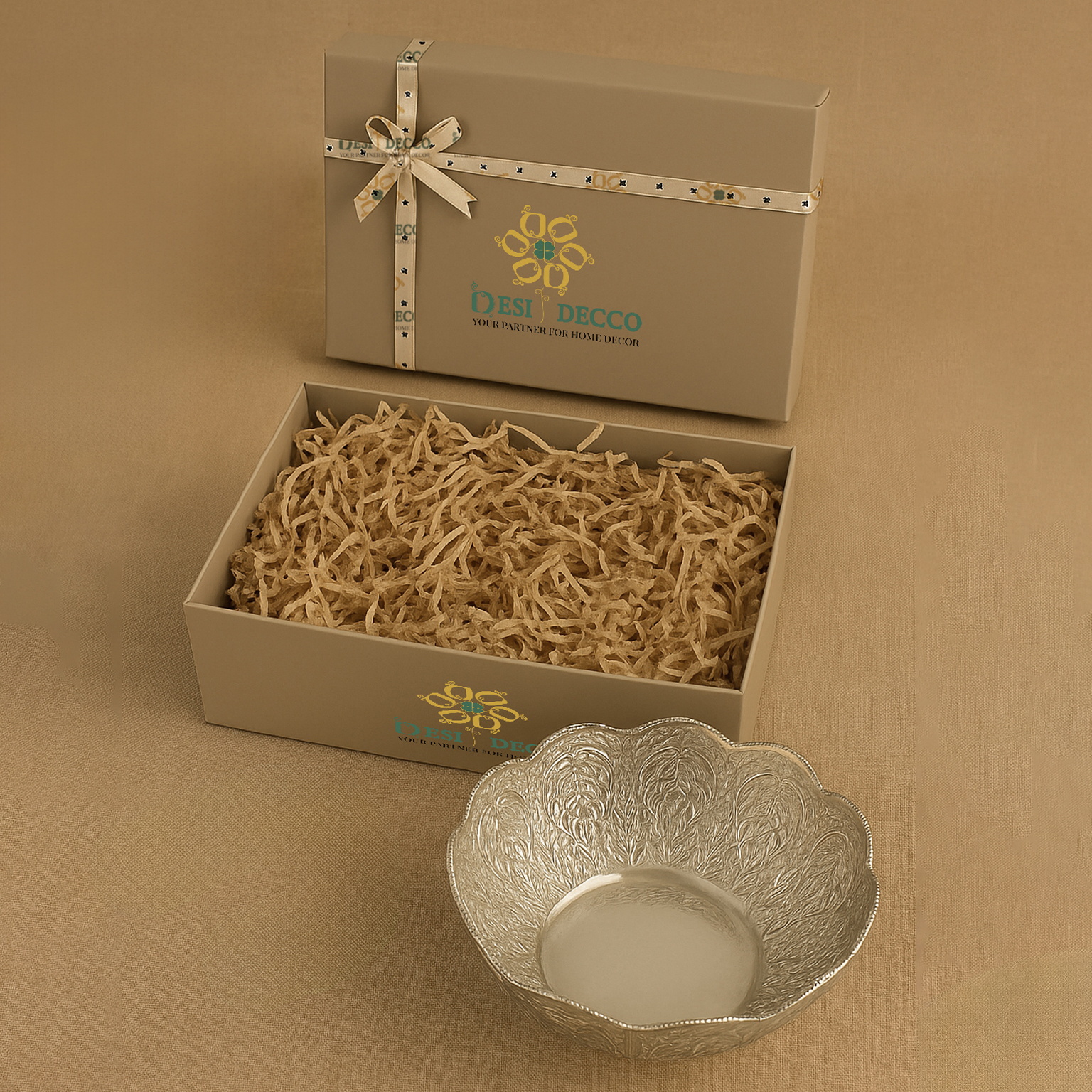 A decorative metal bowl with a silver-colored finish. The bowl has a scalloped rim and is decorated with intricate embossed floral and leaf patterns on its exterior. It rests on a small, circular base.