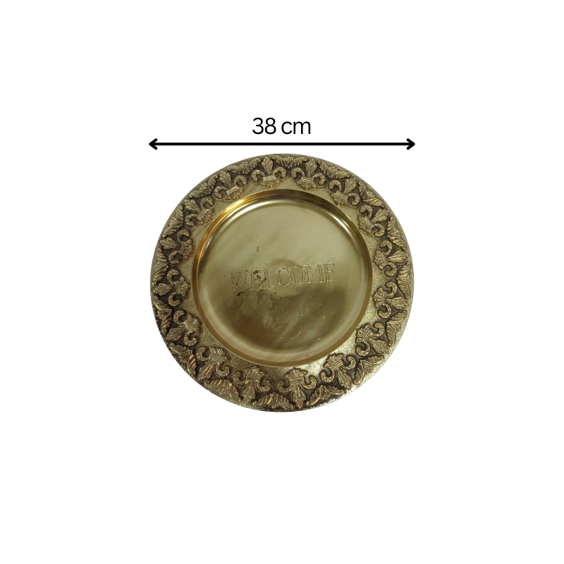 A round, golden-colored decorative plate. The center is a smooth, polished surface. The outer rim is adorned with an intricate, raised floral and leaf pattern.