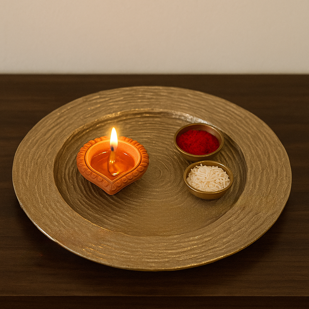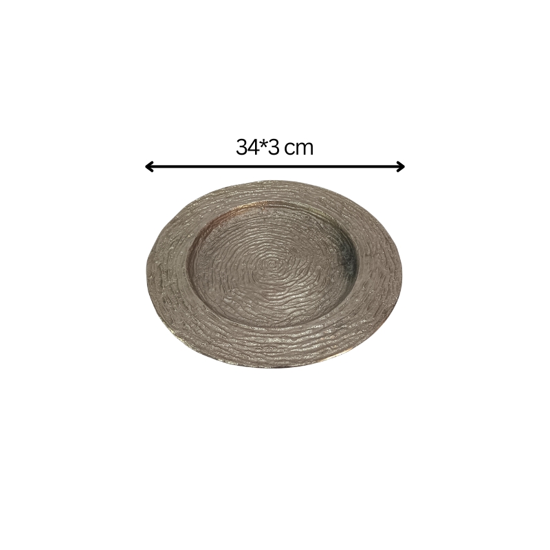 A round decorative plate with a distressed, metallic finish. The entire surface, including the raised rim and the center, is textured with a swirling or fingerprint pattern.