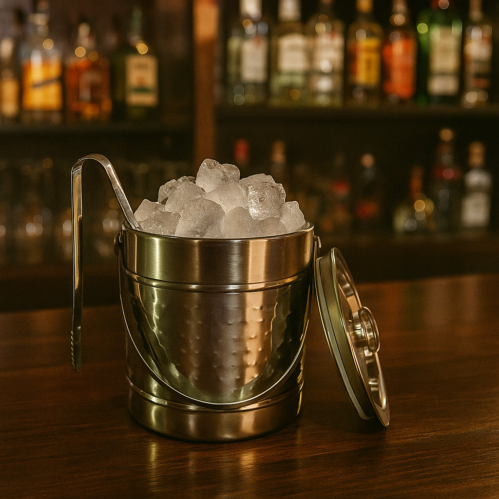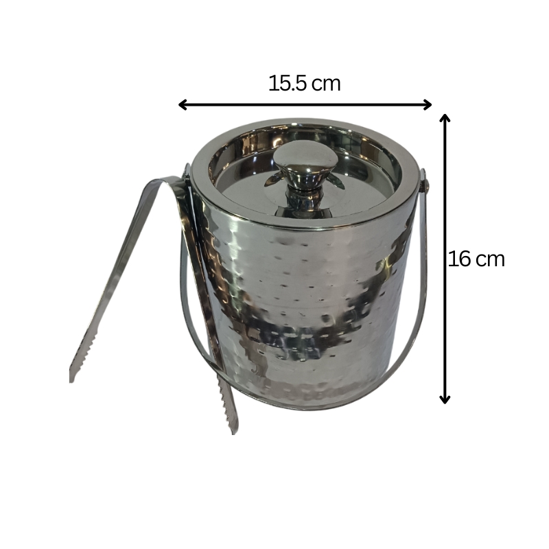A stainless steel ice bucket with a hammered finish, a lid with a knob handle, and a side handle for easy carrying. It also comes with a pair of metal ice tongs for serving.