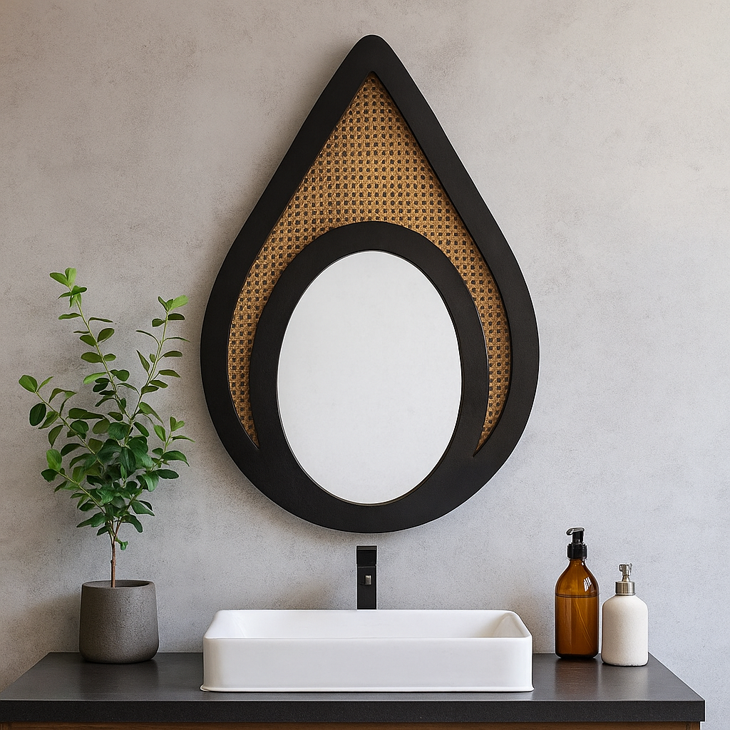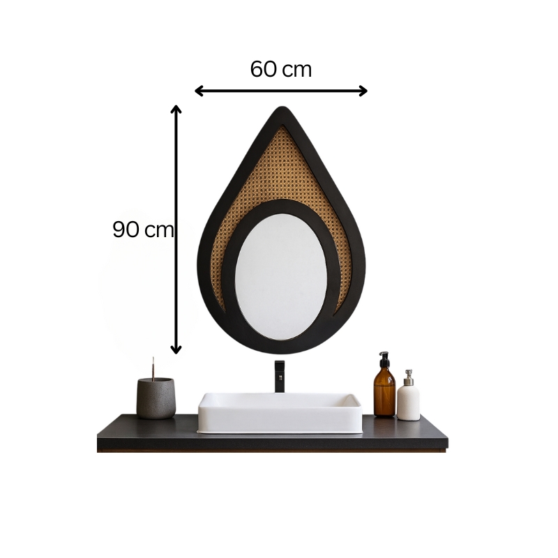 A decorative wall mirror with a distinctive teardrop or elongated oval shape. The frame is black and features a woven cane insert in the upper portion, surrounding a smaller, oval-shaped mirror at the bottom.