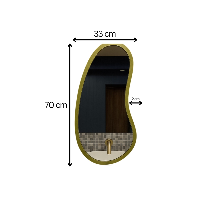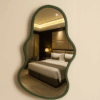 A long, narrow mirror with an irregular, kidney-like shape. The frame is a muted, pale green color with a textured finish.