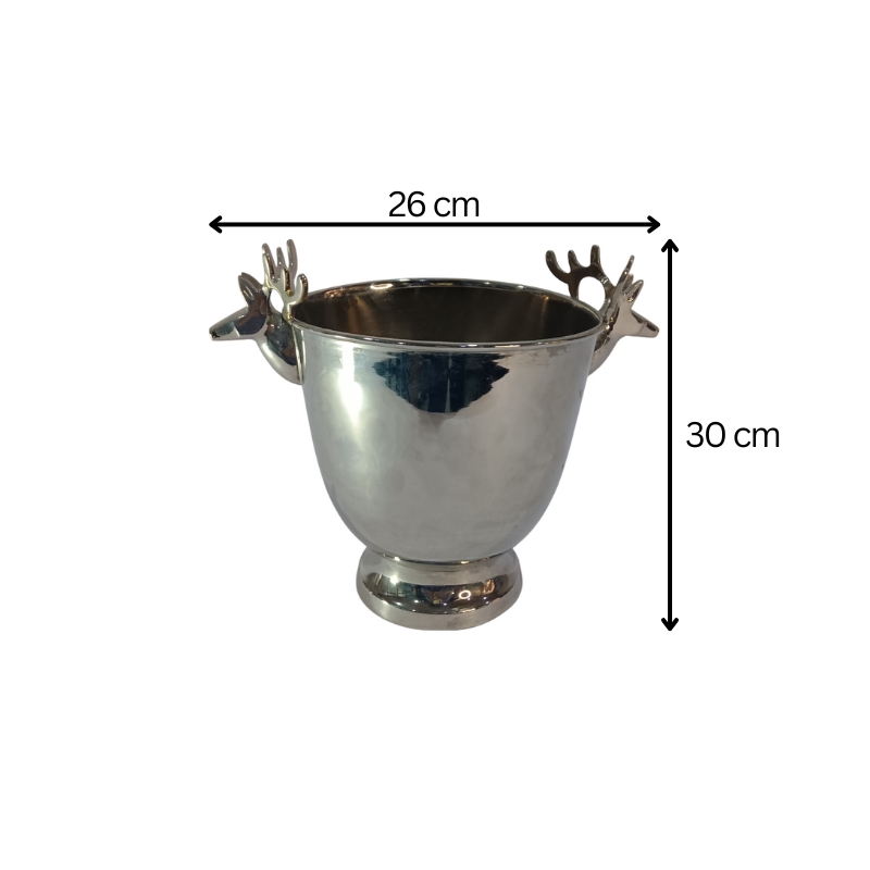 A stylish metallic wine chiller with a polished silver finish. It features two decorative handles shaped like deer heads with antlers, adding an elegant and festive touch. Perfect for keeping wine or champagne bottles chilled during gatherings and celebrations.